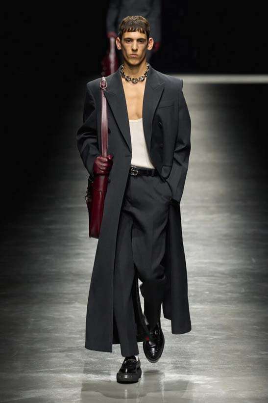 Хоч дизайнер і був розлючений нападами на його дебютну колекцію для Gucci, він відмовився дозволити цій риториці вплинути на створення його першої чоловічої колекції для бренду. Де Сарно — витончений митець. Починаючи від великих сумок та петельок для ключів на рюкзаках і завершуючи підкладками з клеєної шкіри у верхньому одязі, делікатно заокругленими формами та новим ефектом тіні на монограмі GG, він — людина, що спеціалізується на деталях, пурист.